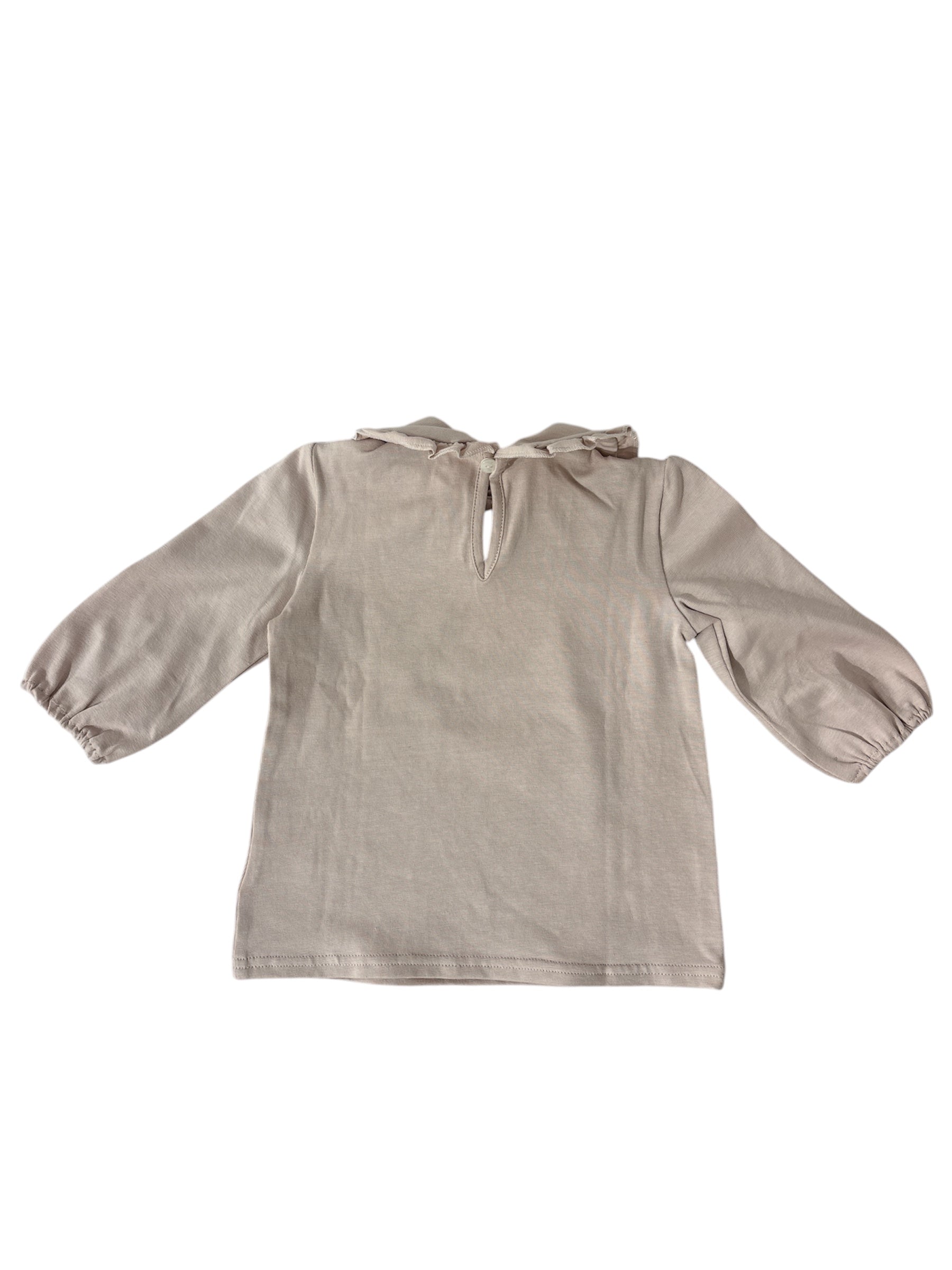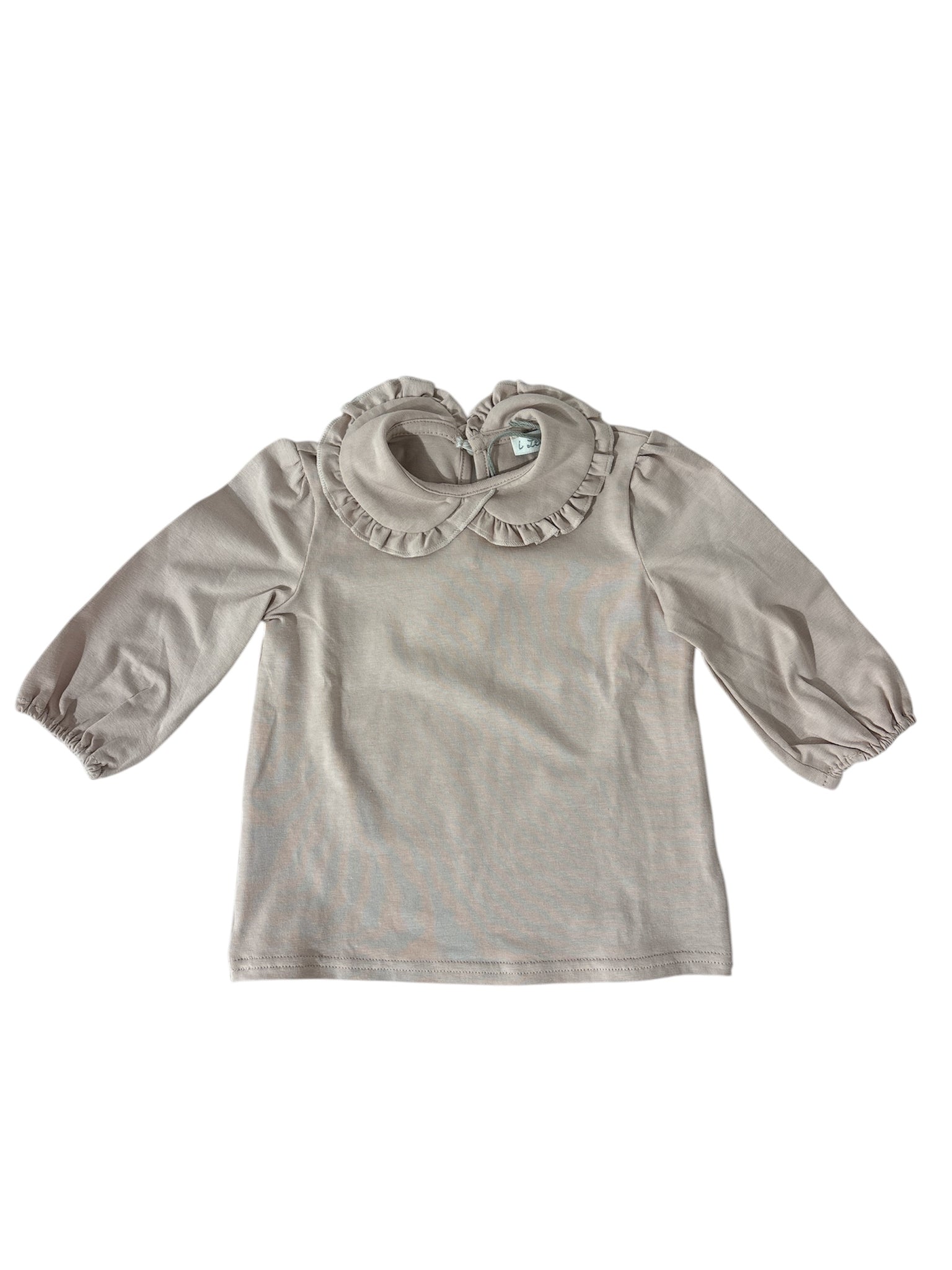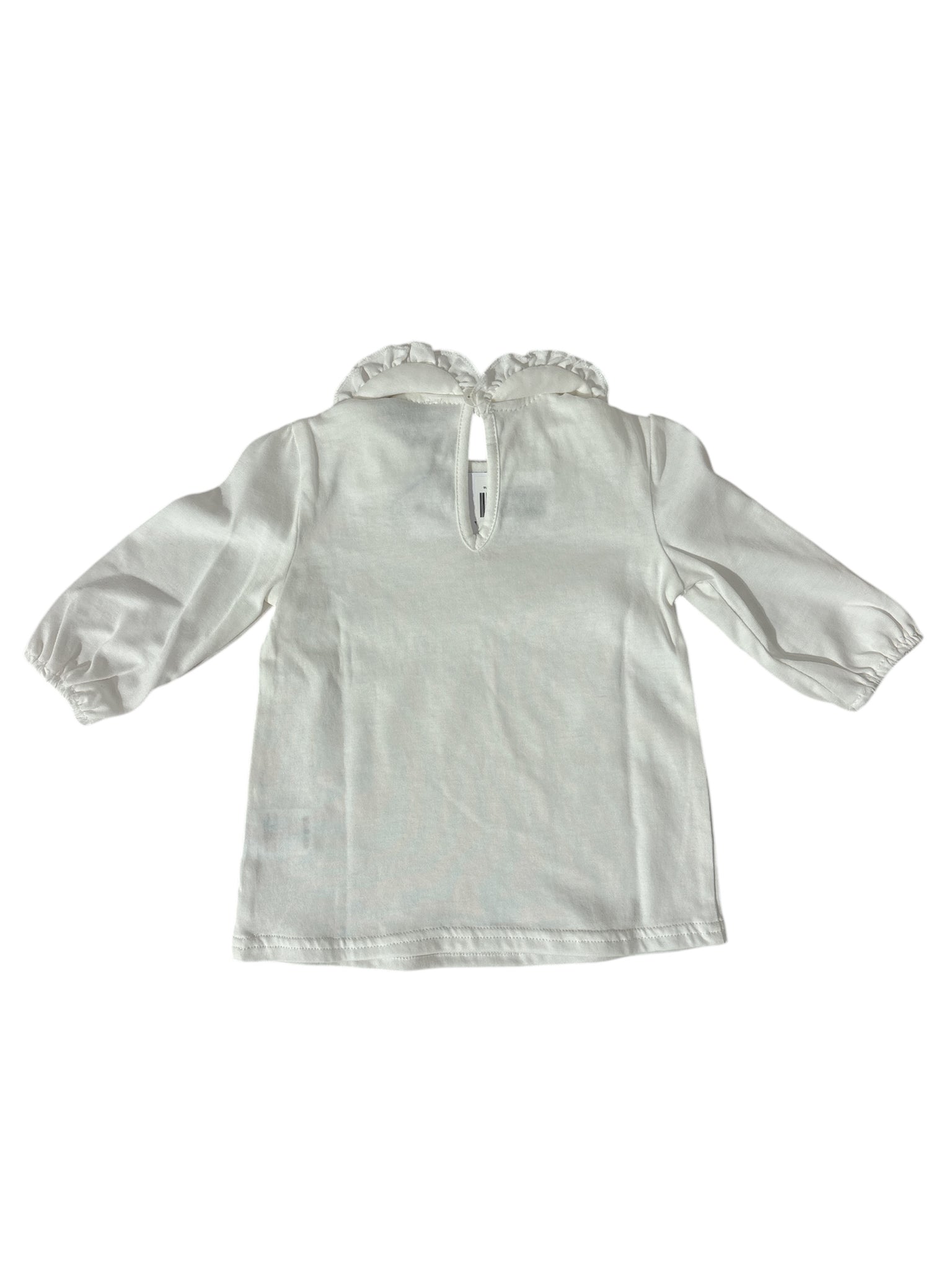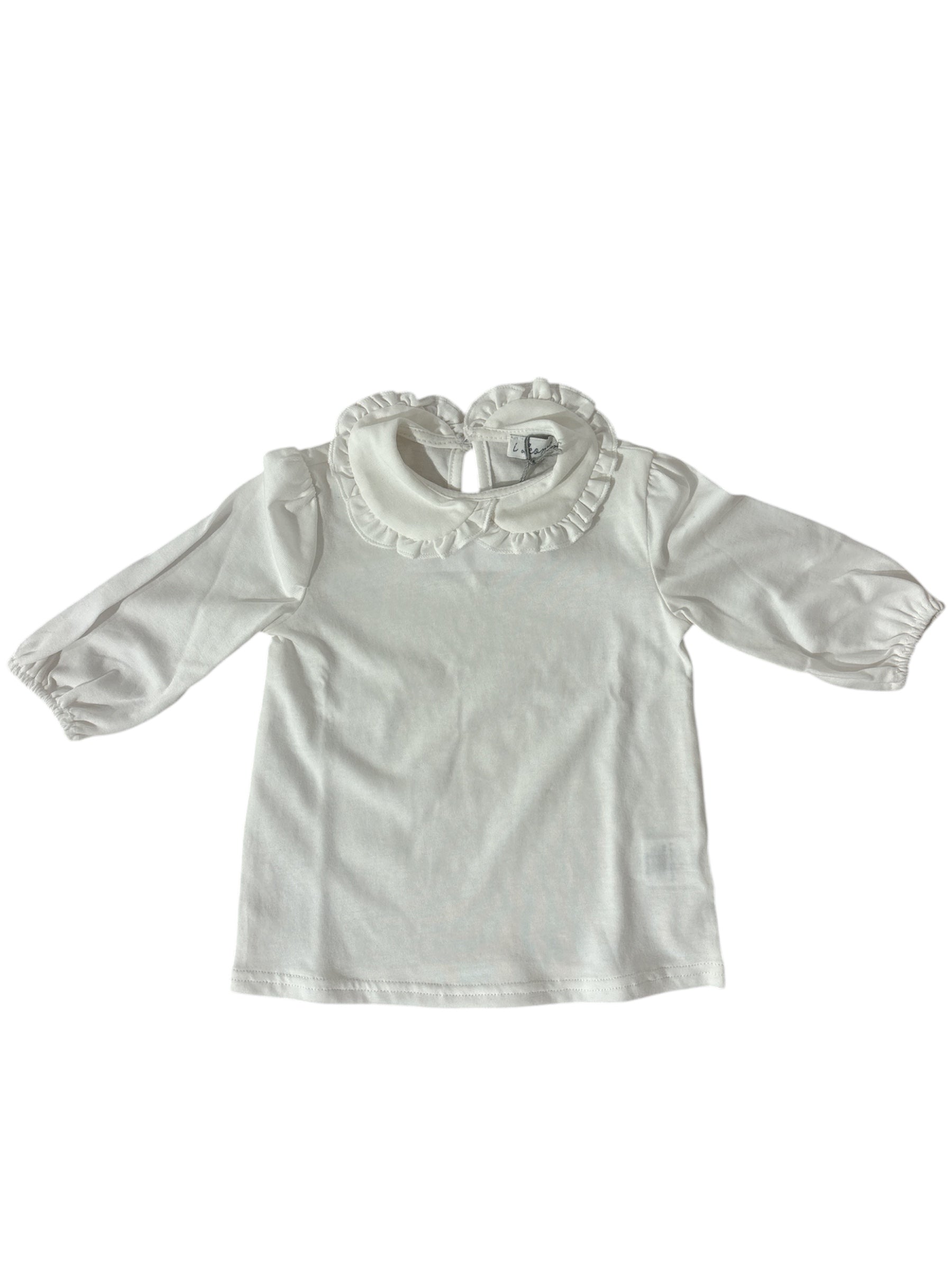 Questa dolce maglia in cotone elasticizzato (95% cotone, 5% elastan) è perfetta per un look comodo ma curato. Il suo delicato color latte e il colletto arricciato con volant donano un tocco romantico e raffinato. Le maniche lunghe con polsino elastico garantiscono libertà di movimento e una vestibilità confortevole. Ideale per ogni occasione, dalla scuola alle uscite quotidiane