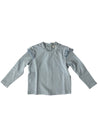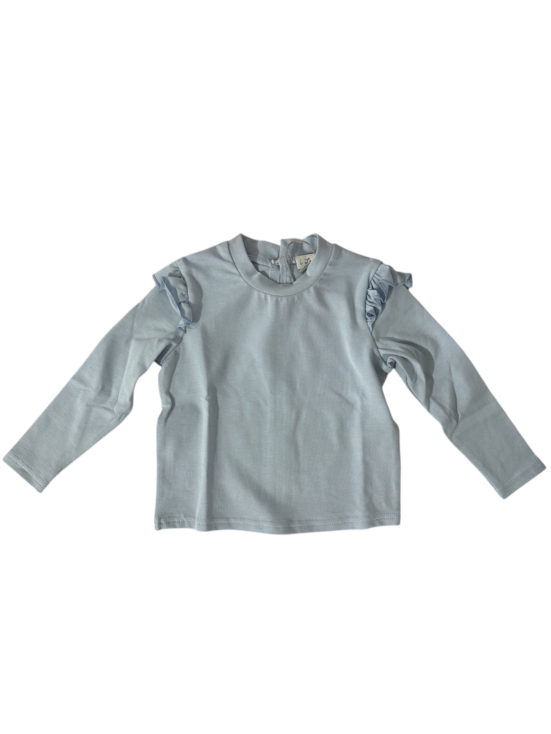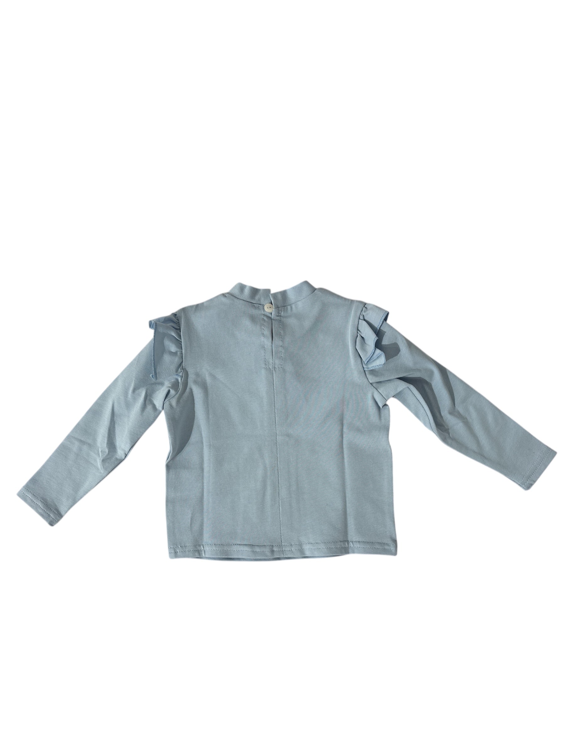 una maglia morbida e confortevole, realizzata in 95% cotone e 5% elastane per carantire comfort e libertà di movimento. Il delicato color cielo si unisce a romantici dettagli di rouge sulle spalle, mentre la chiusura con bottone sul retro facilita la vestizione. Un capo caldo, pratico e raffinato, perfetto per ogni occasione