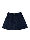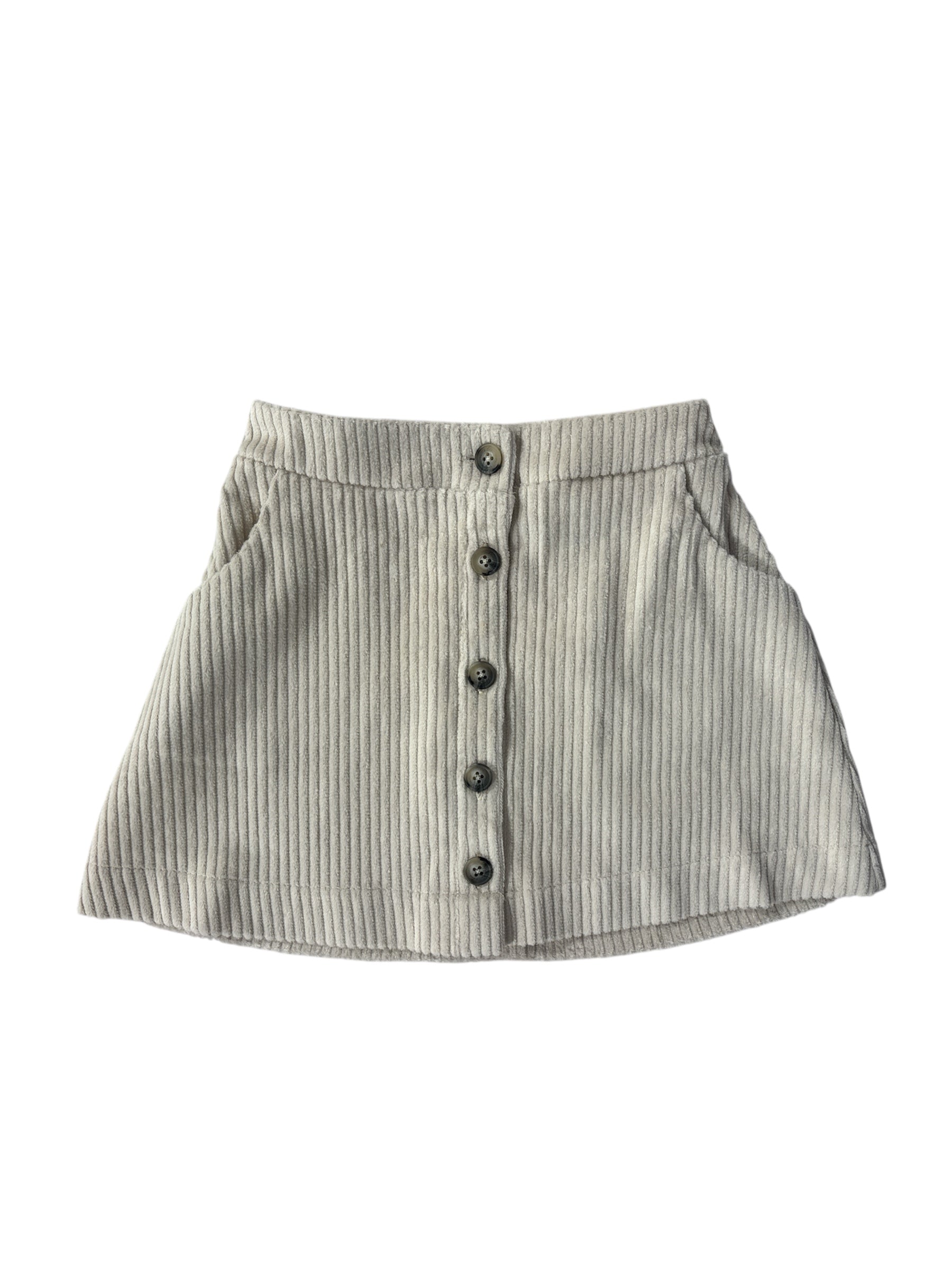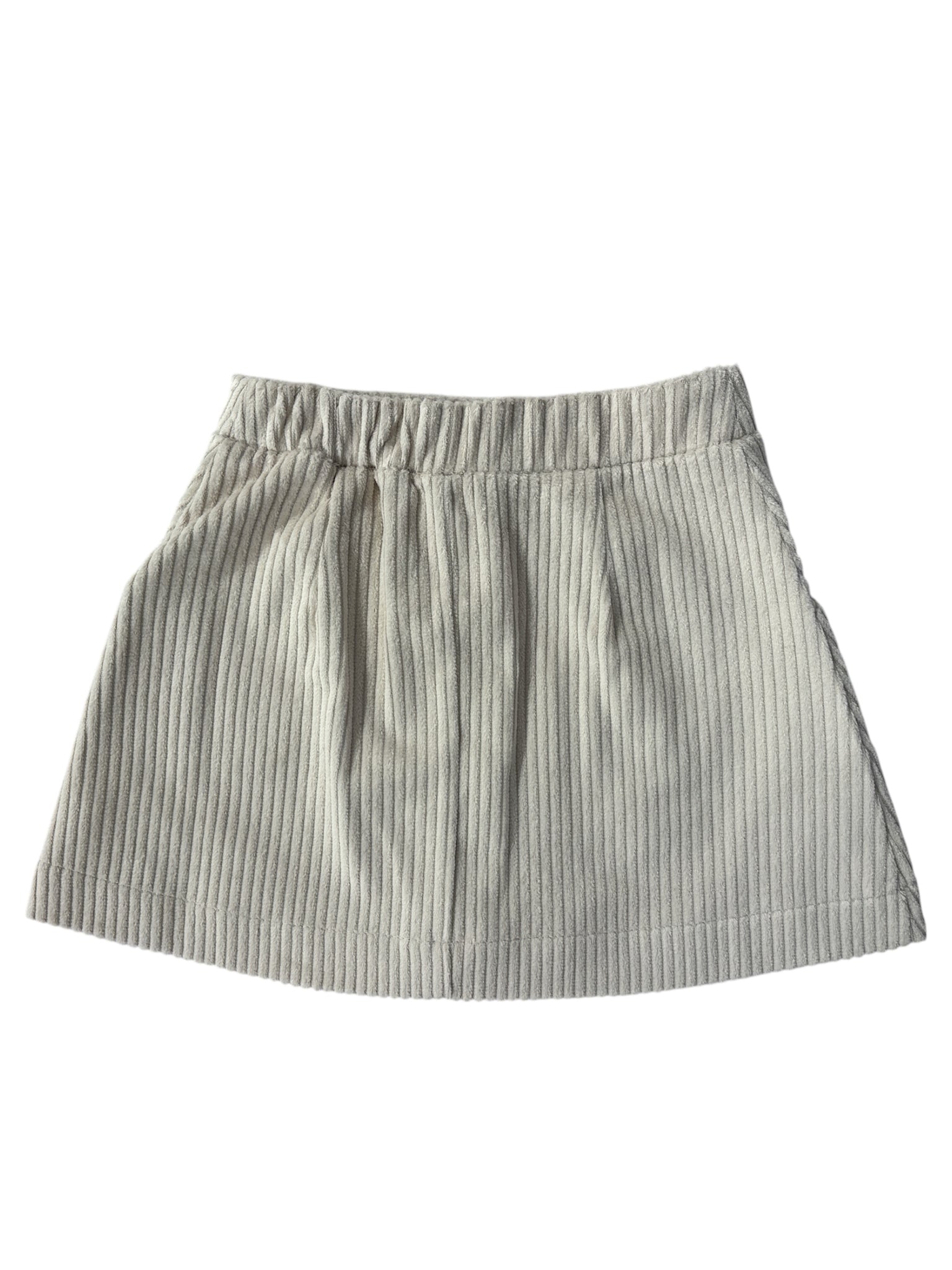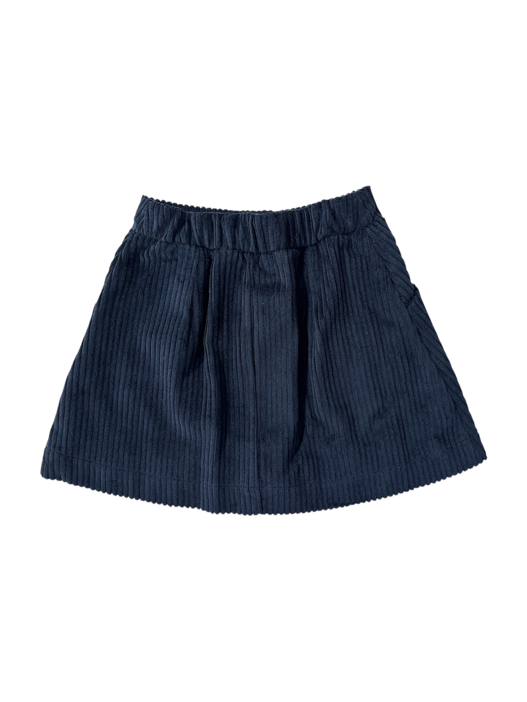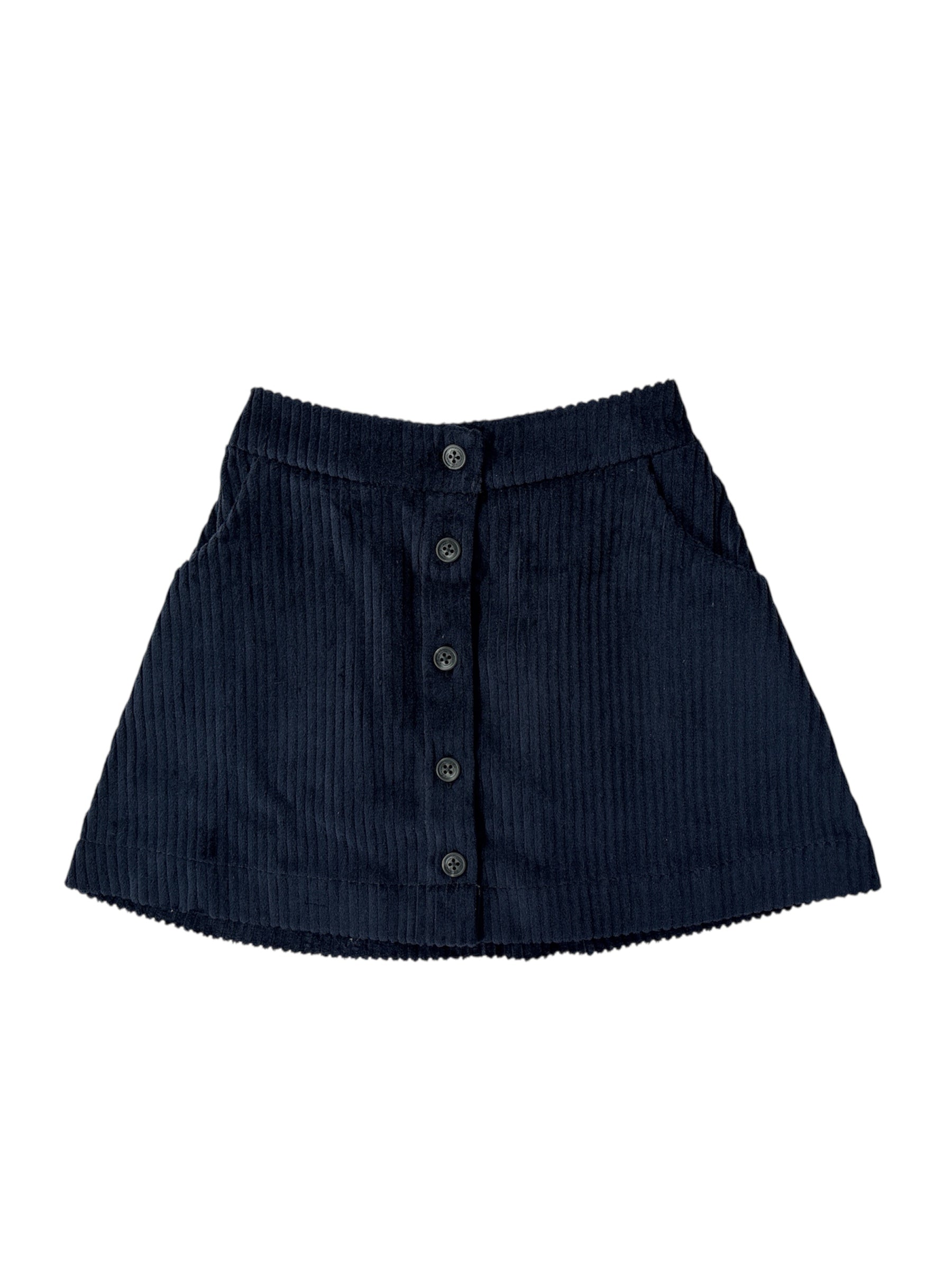 Gonna a trapezio, realizzata in velluto a coste nei toni del blu, latte e tortora, apertura centrale con bottoni ed elastico in vita.