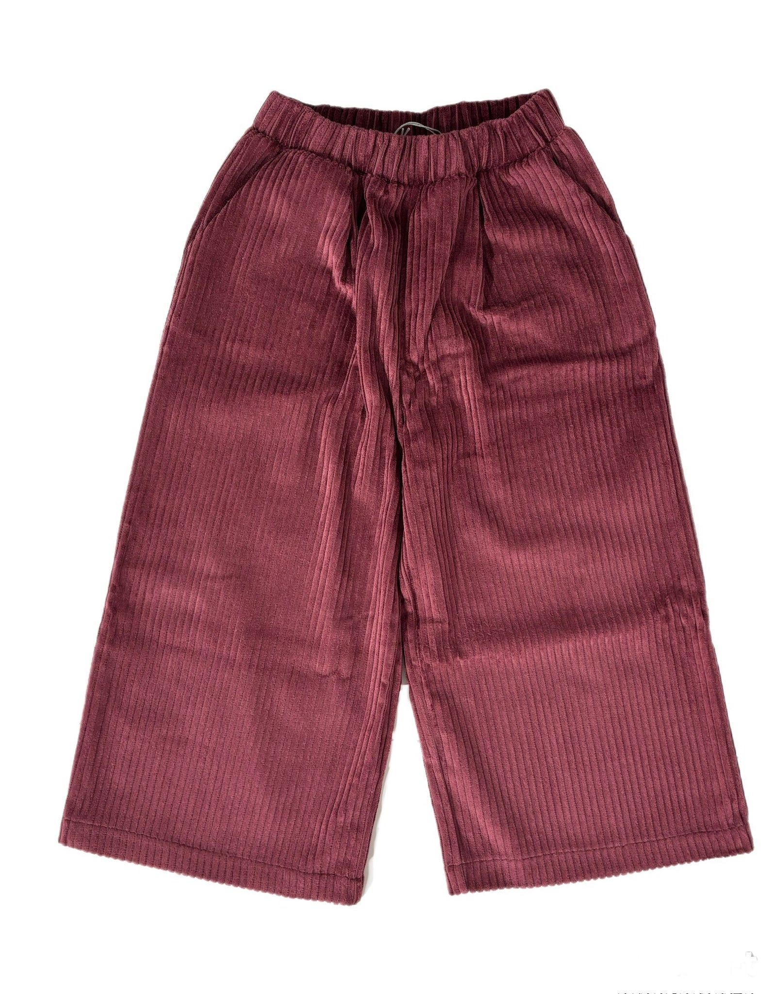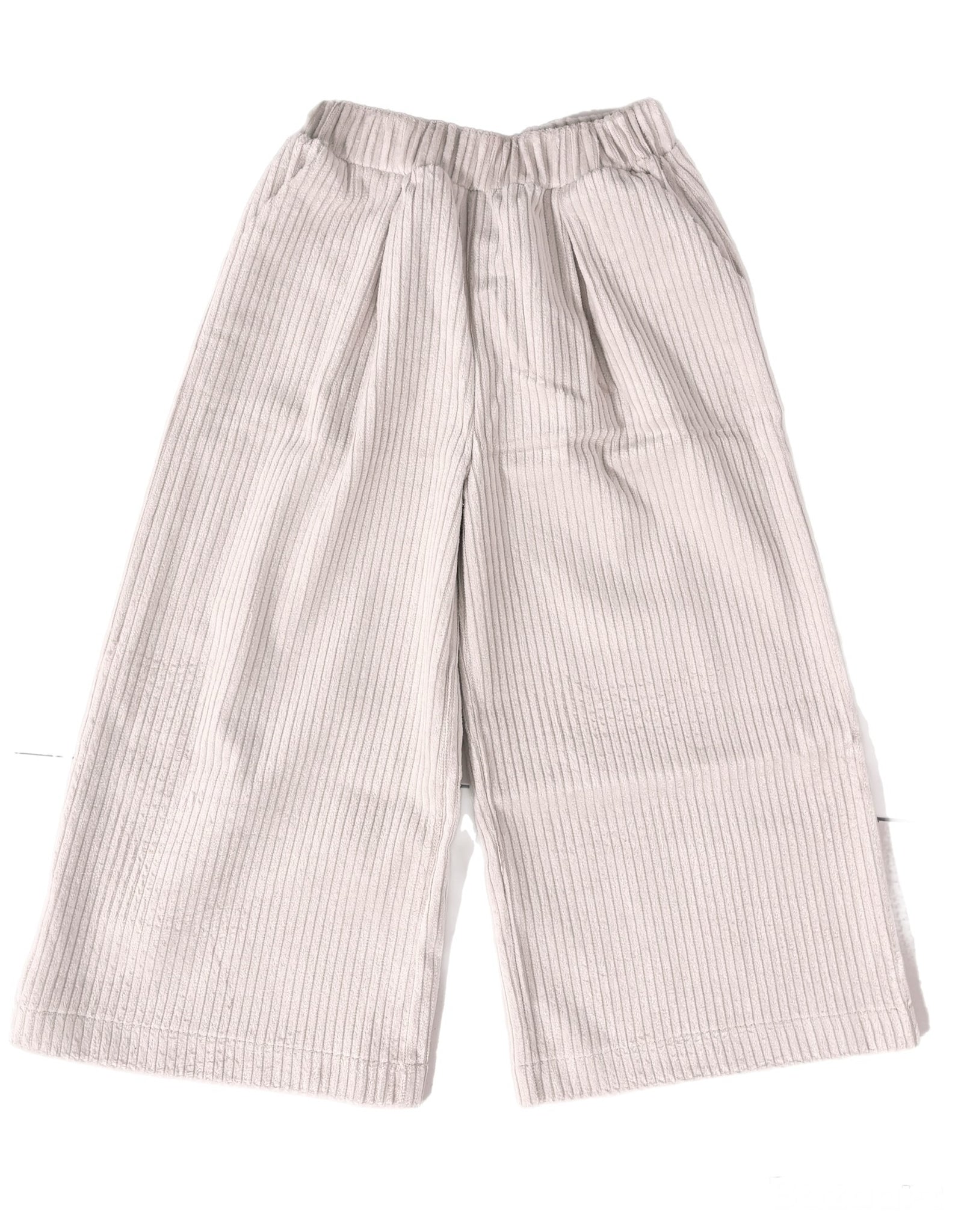 Pantalone palazzo in velluto a coste grandi colore Ghiaccio, con pences davanti e tasche applicate dietro. Vestibilità abbondante, (per bambine magre in vita è consigliabile una taglia in meno).