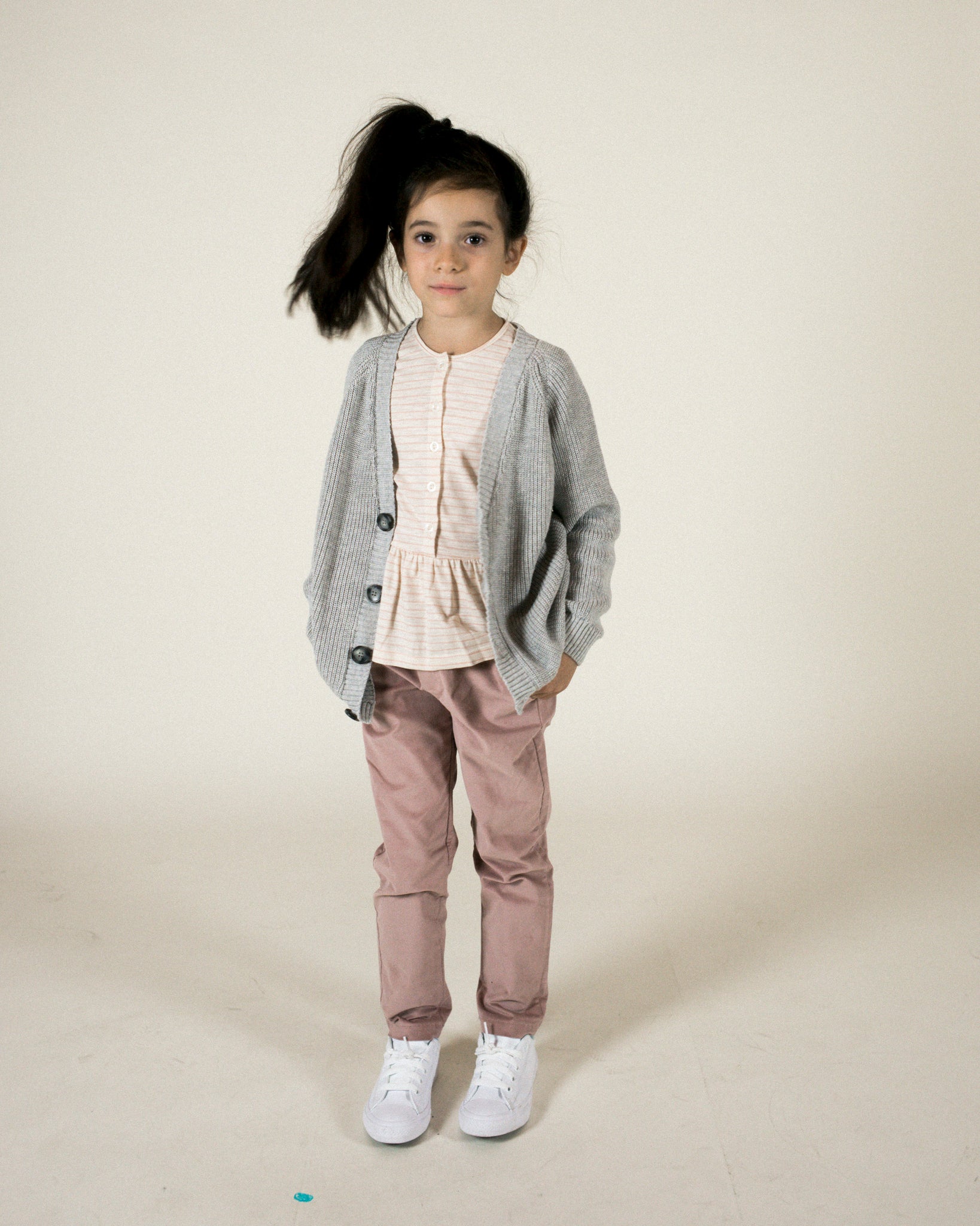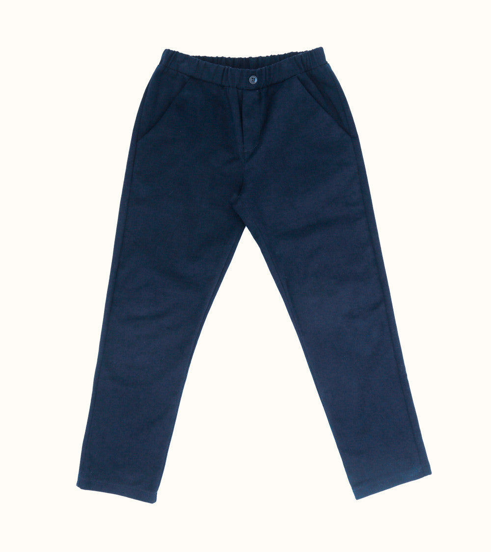 Pantalone in velluto millerighe stretch, con gamba slim, elastico in vita, finta patta e finta abbottonatura davanti